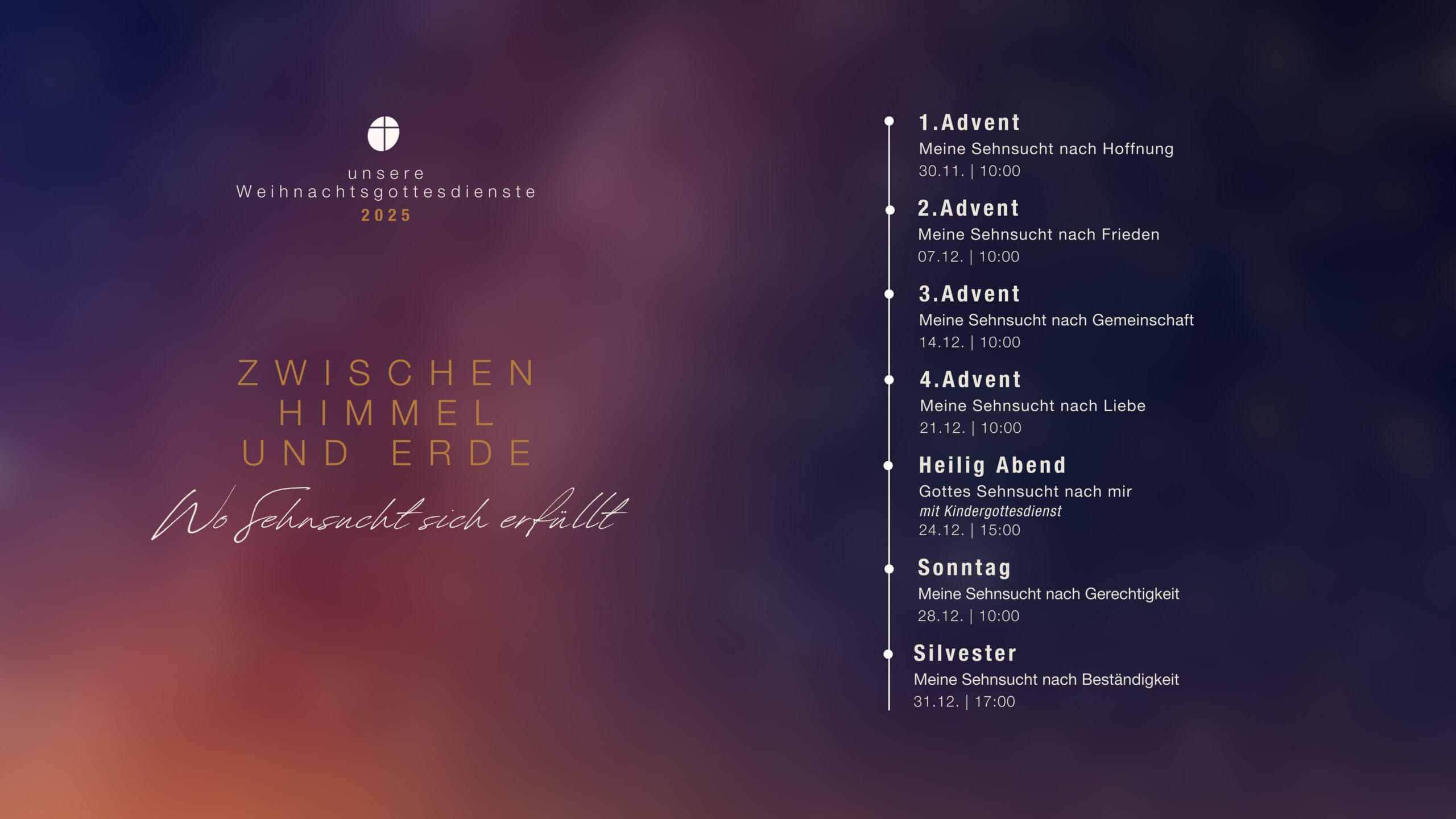 In dieser Advents- und Weihnachtszeit tauchen wir mit der Predigtreihe „Zwischen Himmel und Erde” in die tiefsten Sehnsüchte unseres Herzens ein: Hoffnung, Frieden, Gemeinschaft, Liebe, Gott, Gerechtigkeit und Beständigkeit. Doch es ist nicht nur unsere Sehnsucht – Gott sehnt sich nach uns! Die Welt verspricht viel, liefert aber wenig: Statt Frieden finden wir Krieg und […]