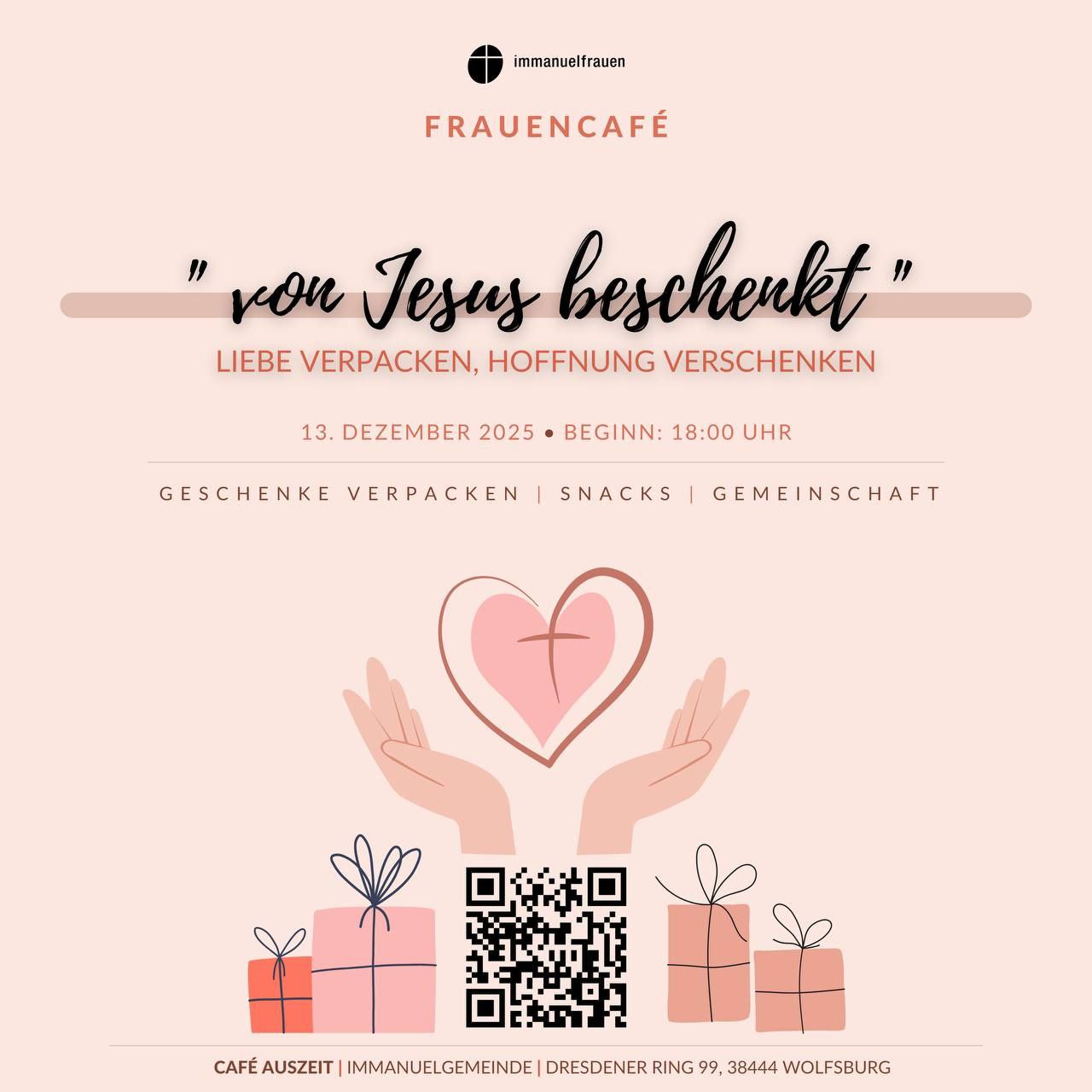 Café Auszeit Dresdener Ring 99, Wolfsburg, Niedersachsen, GermanyEinladung zum Frauencafé – „Von Jesus beschenkt“ Gott hat uns in Jesus das größte Geschenk gemacht – seine Liebe. Diese Liebe möchten wir weitergeben. Du bist herzlich eingeladen zu einem besonderen Abend! Unter dem Motto „Von Jesus beschenkt – Liebe verpacken, Hoffnung verschenken“ wollen wir Geschenke für verschiedene Verteilaktionen vorbereiten, um Menschen in unserer Stadt […]