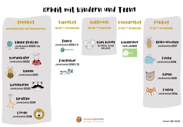 Hierfür sind die Kinder über mehrere Jahre in einer festen Gruppe. Mit etwa 12 Jahren wechseln die Kinder in die Jungschar, die am Dienstag Abend stattfindet.